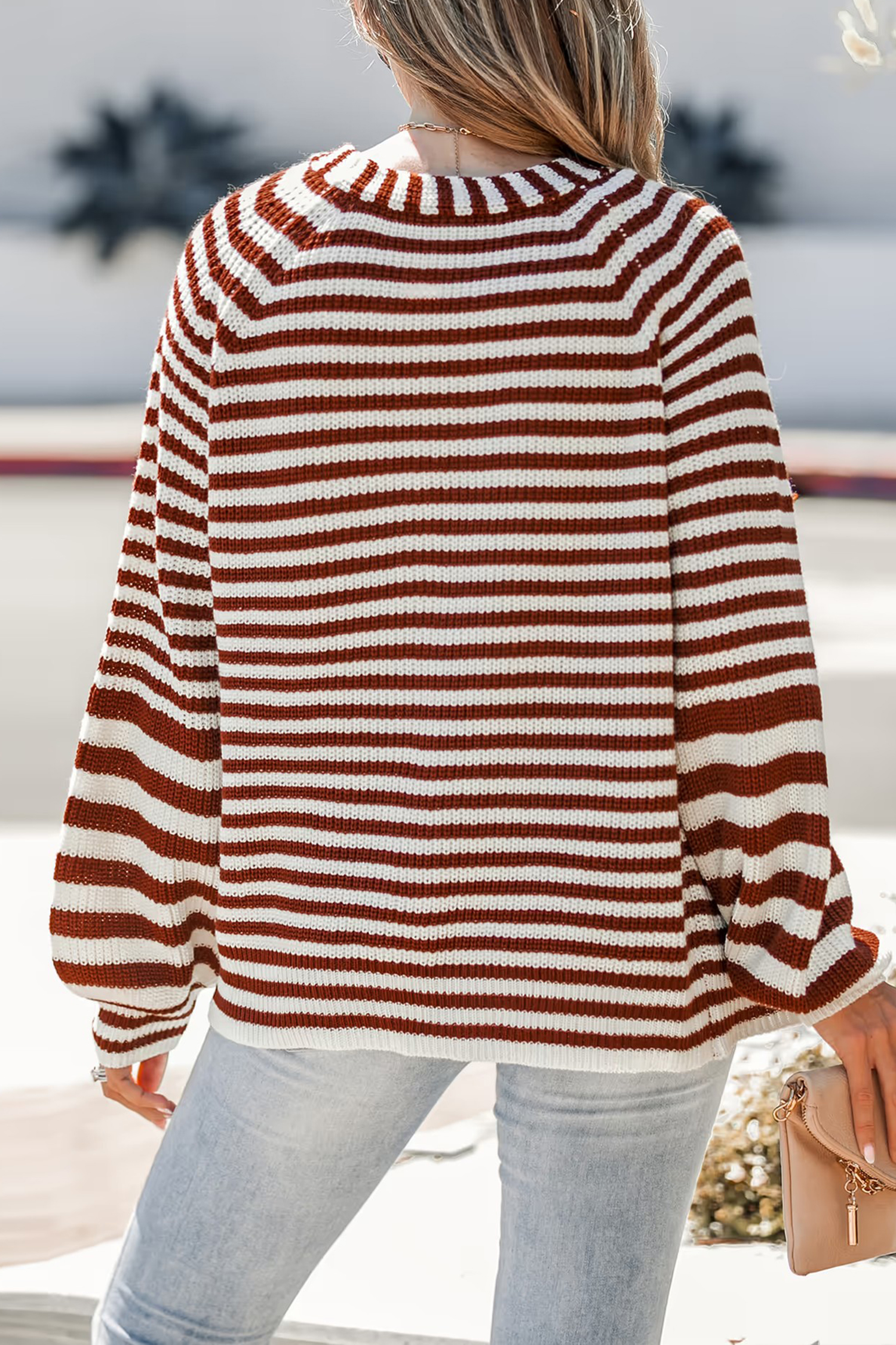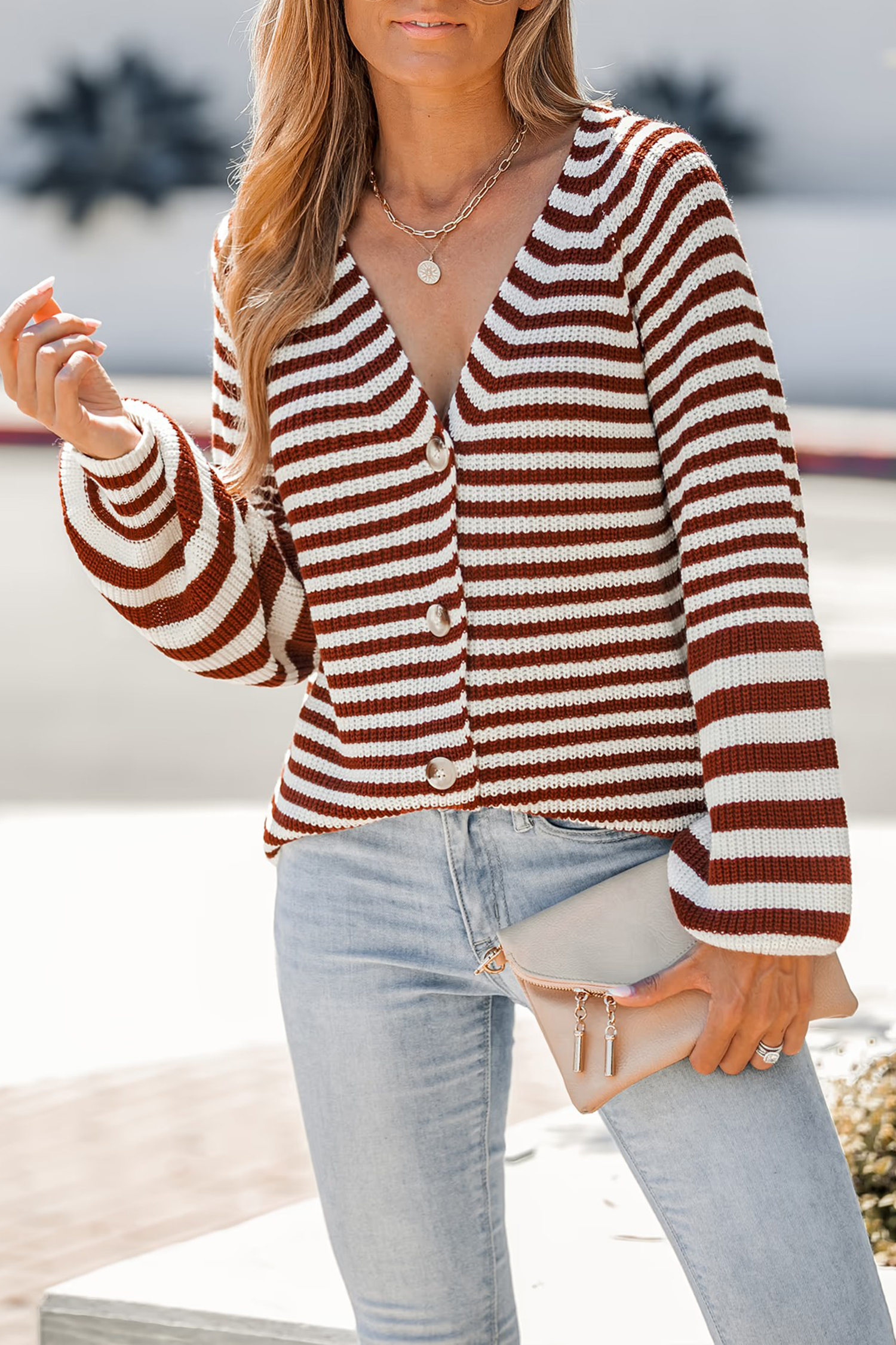 Wrap yourself in timeless style with our Striped V-Neck Buttoned Cardigan. The classic stripes and elegant v-neck, complemented by the buttoned front, create a versatile and sophisticated layering piece that effortlessly enhances any outfit.
